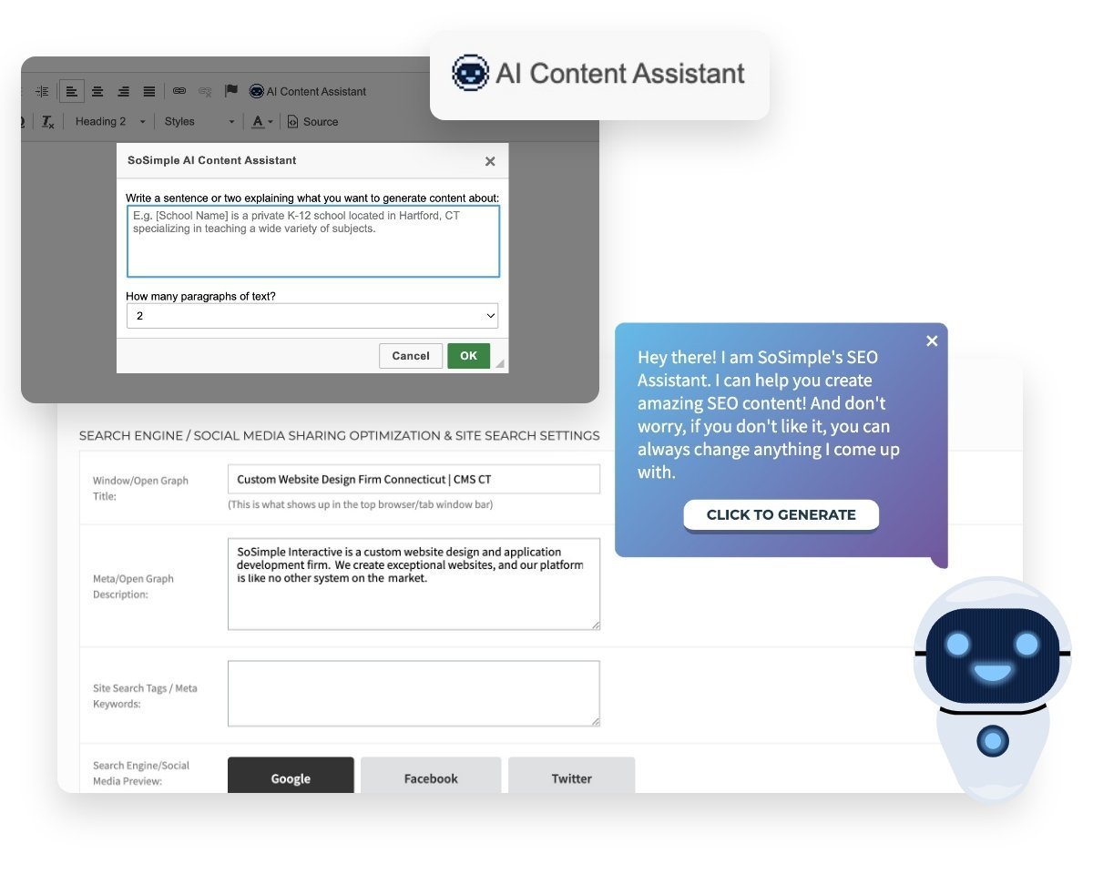 SoSimple has launched these tools to all clients. This is a trial run, so if you notice any issues please lets us know. We have been using it and it has been extremely helpful so far. From Page Settings on any page within the website, or within individual blog posts you can manage SEO. To generate on-page content, each editor now has a new button called "AI Content Assistant". Simply add a descriptive statement for the content you need, choose the number of paragraphs and the content will be generated.