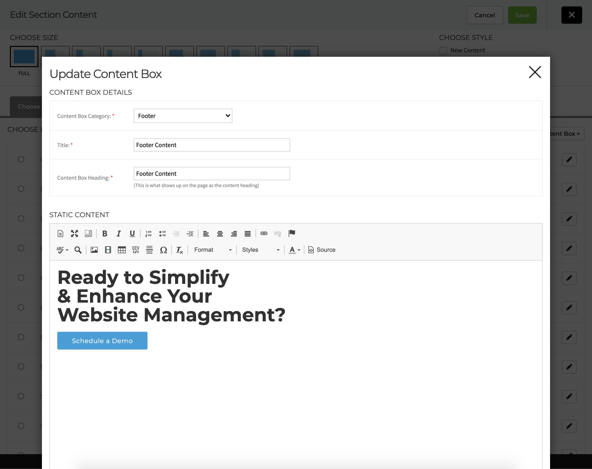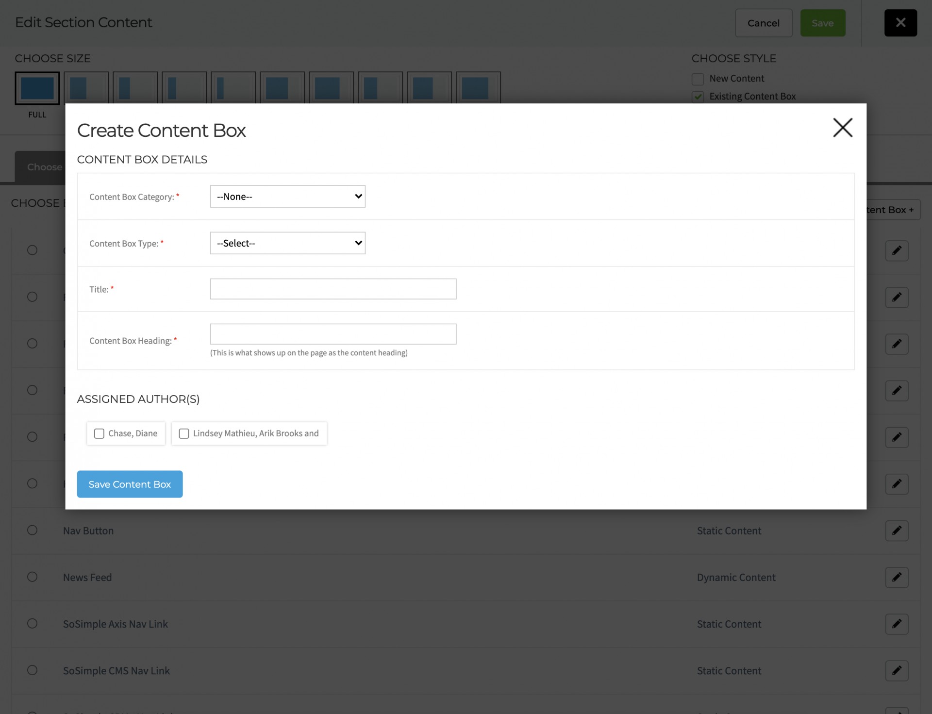 The second enhancement includes an updated Edit option, which allows clients to edit existing content boxes directly from the Existing Content Box style layout editor. When the Edit button to the right of any existing box is clicked, clients will now see the full editor for the content box in a pop-up window, allowing them to more easily make changes to shared content boxes, without having to navigate away to the Content Boxes section of the CMS.
