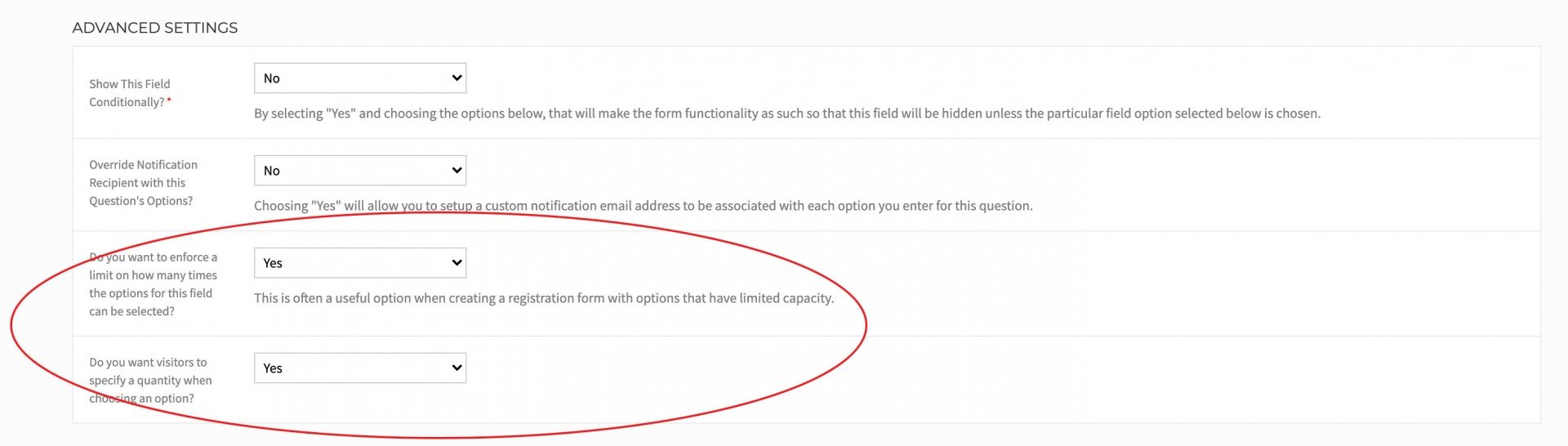 Illustrated in the image above, when this new advanced setting option is set to "Yes", a second new advanced settings appears, allowing you to automatically add quantity field options associated with the field options of your original limited use question.