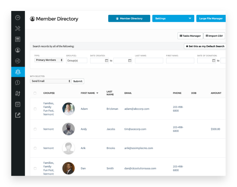 Marketing, communications, and advancement teams will find our built-in email and text messaging capabilities to be vital tools in their day’s activities. Our contact manager easily integrates with your existing database for seamless communication with your communities.